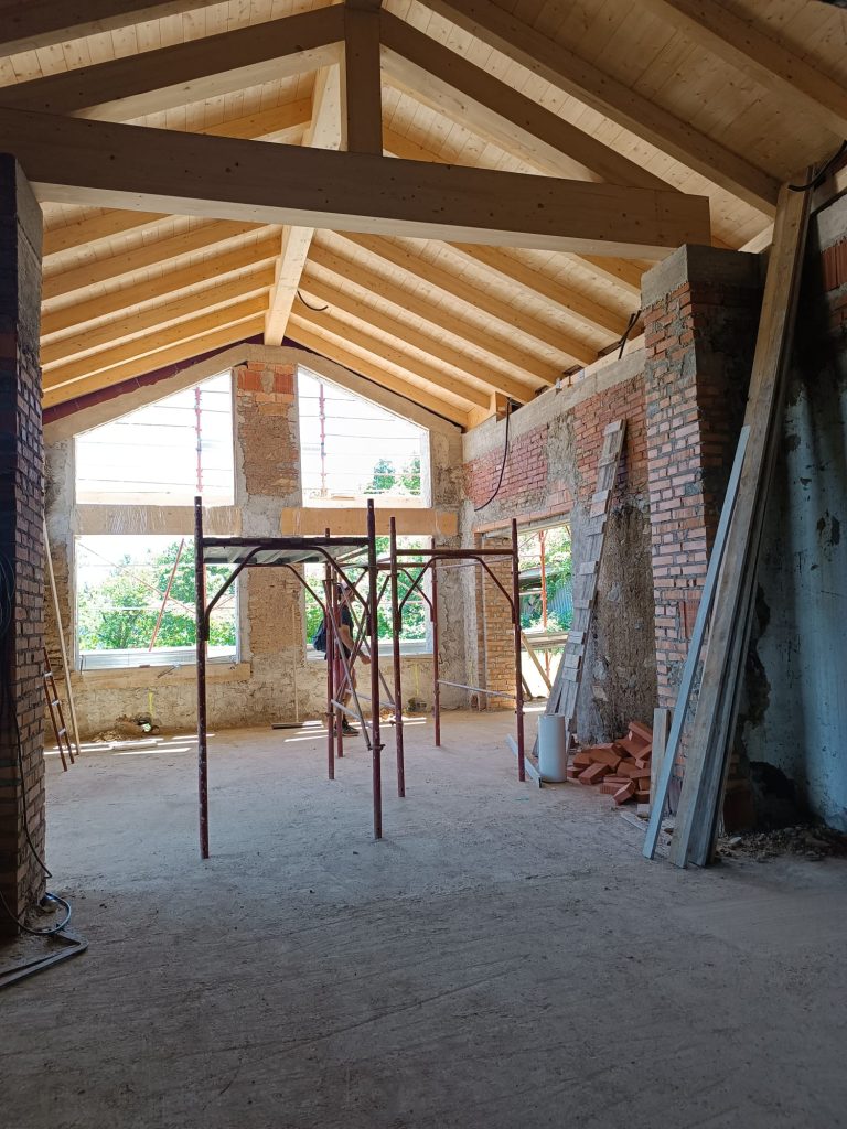 In questi mesi sono stati realizzati i solai in legno del primo piano, aperti nuovi vani di porte e finestre e modificati quelle esistenti, completata la struttura portante del tetto, montato la lattoneria e tinteggiata la facciata.