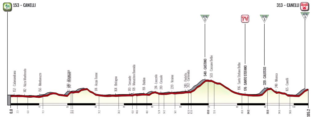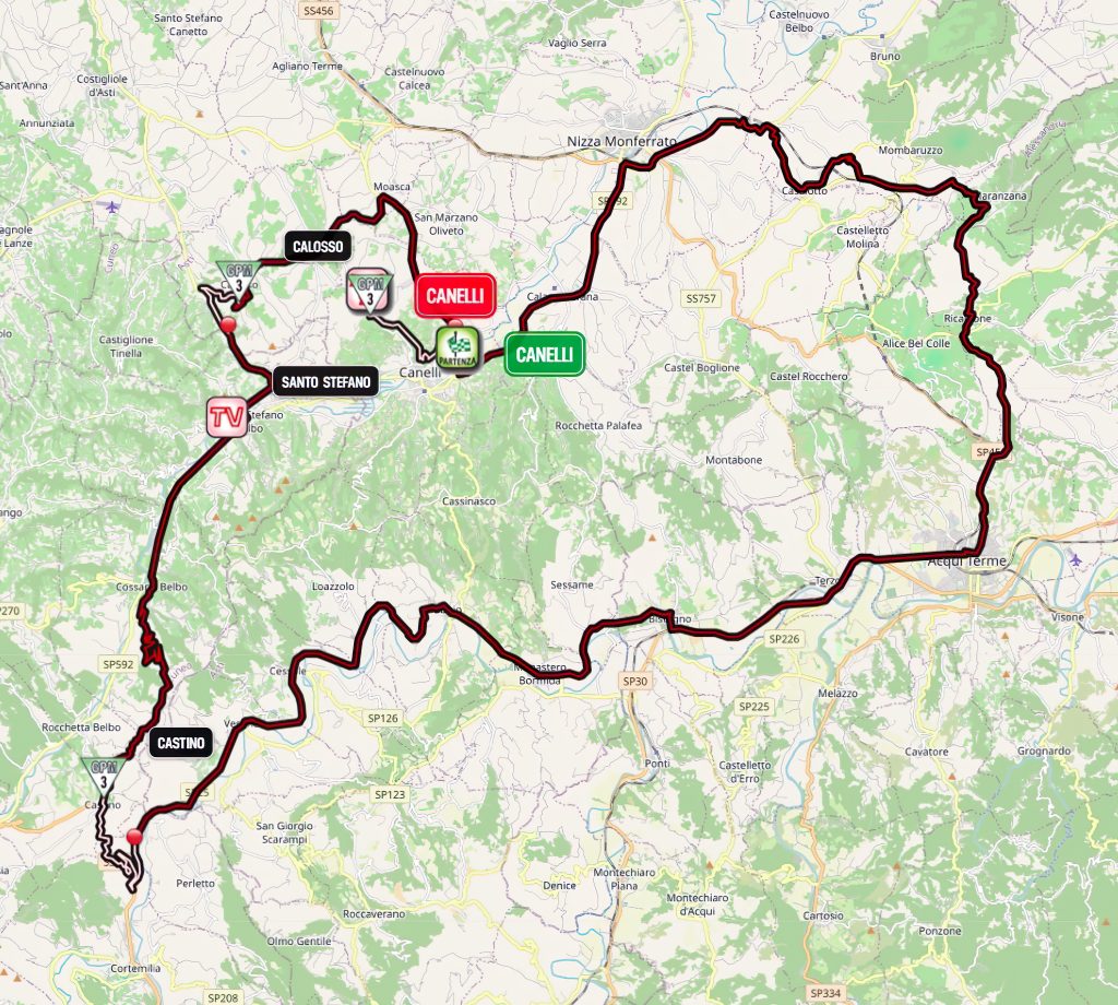 Canelli ospita sia la partenza che l’arrivo della sesta tappa che si snoderà per 104,4 km attraversando le province di Torino, Alessandria, Asti e Cuneo. Sono tre i gpm previsti per la giornata, tutti di terza categoria, l’ultimo è posizionato proprio sul traguardo. Nella prima parte di gara è previsto un tracciato ondulato ma senza particolari asperità, poi dal chilometro 67 si inizia a salire verso Castino. Un breve tratto pianeggiante porta il gruppo al traguardo volante di Santo Stefano, poi la salita di Calosso e infine l’arrivo in pendenza.