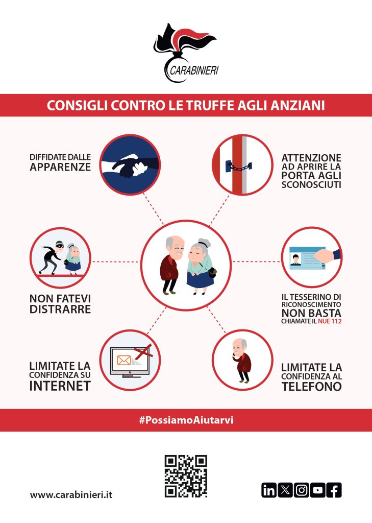 L’Arma dei Carabinieri ha avviato una campagna di comunicazione finalizzata a rafforzare la prevenzione e accrescere la funzione di rassicurazione sociale, deNominata “Campagna di Prevenzione delle truffe in danno di anziani”.