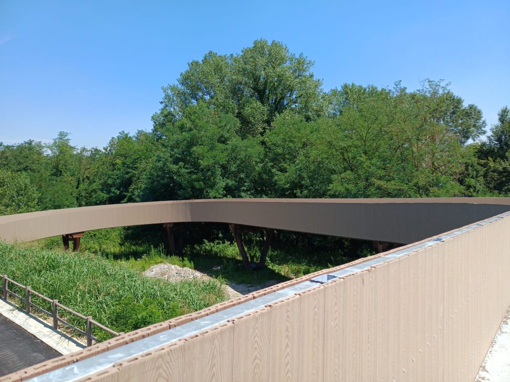 L’opera strutturale è costata circa 2 milioni di euro (1,7 milioni di euro forniti dalla Regione Lombardia e circa 300.000 dalla Città Metropolitana di Milano), terminata e già collaudata dal punto di vista statico, ha riguardato il rifacimento di tutto l’impalcato, per cui sono state mantenute le pile in corten e sono invece state sostituite le travi in legno con una struttura in acciaio corten che ne garantisce la durata nel tempo in un ambiente molto umido e caratterizzato dalla presenza di fiume e vegetazione.