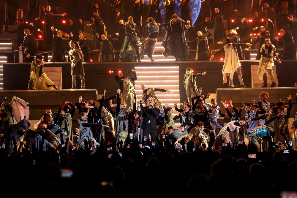 Sull’immenso spazio scenico 3D,nel quale tutte ledimensioni – orizzontalità, verticalità, profondità – vengono esplorate ed esaltate, la narrazione fonde i linguaggi del cinema e del teatro.Racconti per immagini, sviluppati – per la prima volta in un live di Baglioni – su grandi schermi e atmosfere, costumi e tatuaggi tribali che richiamano pellicole come “Mad Max” o “Codice Genesi” si mescolano, infatti, al ruolo e agli interventi di un coro che si ispira alla tragedia greca e a imponenti movimenti scenici che richiamano gli allestimenti teatrali delle rappresentazioni operistiche. Ben 101, infatti, gli artisti sul palco: 21 polistrumentisti della band-orchestra diretta da Paolo Gianolio e 80 tra coristi, ballerini, performer, tra i quali 28 giovani artisti dell’Accademia Internazionale del Musical – alcuni al loro esordio in una produzione così importante – curati da Enrico Sortino, diretti dal maestro Francesco Di Nicola, con la direzione musicale di Tommaso Vittorini.