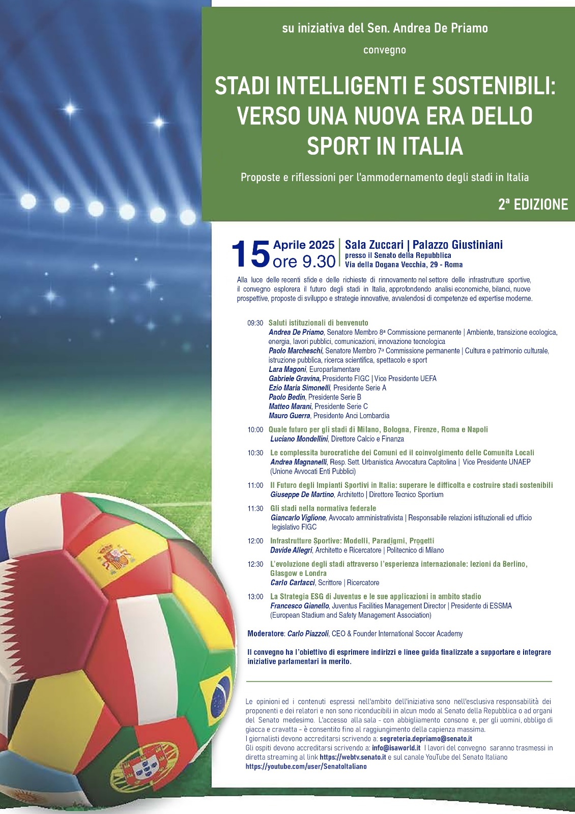 Stadi intelligenti e sostenibili verso una nuova era dello sport in Italia. Il tema del convegno che si terrà a Palazzo Giustiniani Roma il 15 Aprile. Questa è una seconda edizione che sarà condotta da Carlo Piazzoli comasco e da tempo impegnato nel mondo dello sport e sopratutto del calcio.