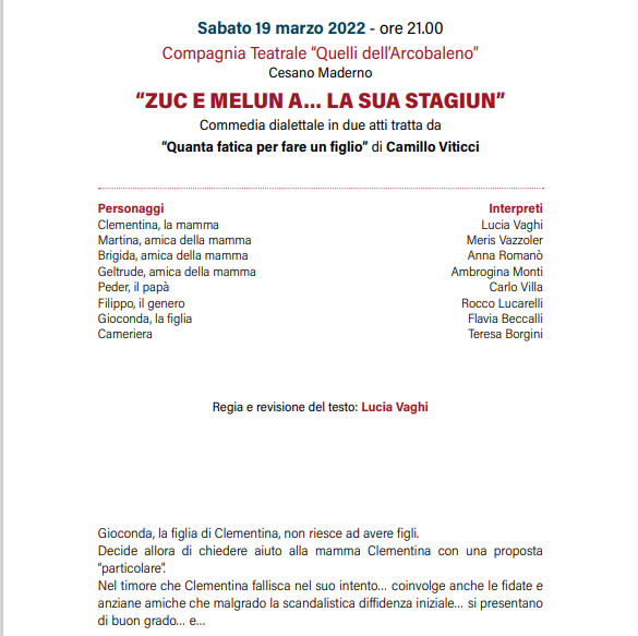 Il prossimo spettacolo sarà il 26 Marzo con la Compagnia teatrale “Impara l’Arte” di Monza dal titolo “Ul Paradis di ciaparatt” commedia brillante in lingua monzese in tre atti.