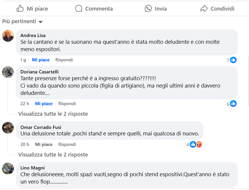 Una delle aree più importanti dell’erbese, Lario Fiere Polo espositivo della Provincia di Como, ha proposto la 50 edizione di Mostra Mercato dell’Artigiano ad ingresso gratuito, entrare e visitare senza spendere un centesimo, fatto salvo di acquistare qualcosa dagli espositori. Sui giornali di questi giorni vedi ERBA NOTIZIE si festeggia per il successo raggiunto di oltre 30000 presenze, vien da dire “Wow, figo, che bravi”, ma la doccia fredda è data dai commenti dei social, che bocciano quest’anno l’esposizione che dovrebbe essere diventata quella di punta dopo la perdita del Bmotorshow con oltre 25000 persone paganti. La fiera delle auto e moto non si svolge più dal 2019, anno precovid, oltre al fatto della crisi, ci sono anche risvolti organizzativi che hanno impedito ad oggi di riportare questa fiera visitatissima e ben organizzata da Giuseppe Lorito e il suo team. Non è l’unica fiera persa, visto che nel corso degli anni post covid si è tentato di organizzare altre eventi fieristici, definiti dai più “Flop“, come ad esempio come raccontatoci la fiera del Beuty, mai più riproposta vista la scarsa adesione