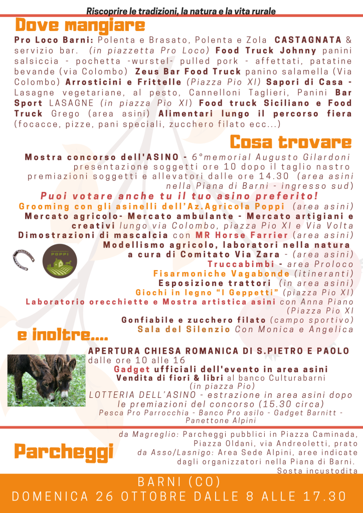 L’offerta gastronomica è più ricca che mai con Polenta e Zola e Polenta e Brasato in area Pro Loco dove non può mancare la castagnata. Nel bar e nel minimarket del paese altre possibilità gastronomiche con piatti caldi o da passeggio. Nell’area mercato saranno presenti numerose bancarelle con street food e food truck e ambulanti con specialità gastronomiche tutte da assaggiare. “Ringraziamo fin da ora tutti i visitatori, i volontari, gli espositori, sponsor, sostenitori e gli amici che ogni anno rendono possibile questa giornata così speciale. Per l’edizione 2025 abbiamo voluto potenziare il servizio food truck per offrire ancora più scelta e qualità, e arricchire l’area bimbi con i gonfiabili prevista al campo sportivo, per il divertimento di tutta la famiglia. Vi aspettiamo con gioia a Barni!” La Festa dell’Asino è un’occasione unica per grandi e piccini di vivere la bellezza della vita contadina, in un contesto autentico, ricco di attività, emozioni e sapori di una volta. Per una gita autunnale fuori porta, Barni è la tappa ideale per immergersi nell’autenticità delle cose semplici, circondanti dalla natura e dai suoi mille colori e con l’occasione entrare in contatto con artigiani, artisti, produttori locali con le loro specialità.