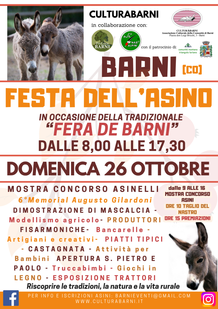 Domenica 26 ottobre 2025 il borgo di Barni, nel cuore del Triangolo Lariano, si anima per uno degli eventi più attesi e amati dell’autunno: la Festa dell’Asino, giunta alla sua sesta edizione. L’evento si svolge in concomitanza con la storica “Fera de Barni”, e promette una giornata all’insegna della vita rurale, delle tradizioni contadine, della buona cucina e del divertimento per tutta la famiglia. Organizzata da Culturabarni, Pro Loco Barni e Gruppo Alpini Barni, con il patrocinio del Comune di Barni e della Comunità Montana del Triangolo Lariano, la Festa dell’Asino è un appuntamento imperdibile per chi ama la natura, i prodotti tipici, la cultura contadina e – naturalmente – gli asini.I PROTAGONISTI: GLI ASINI