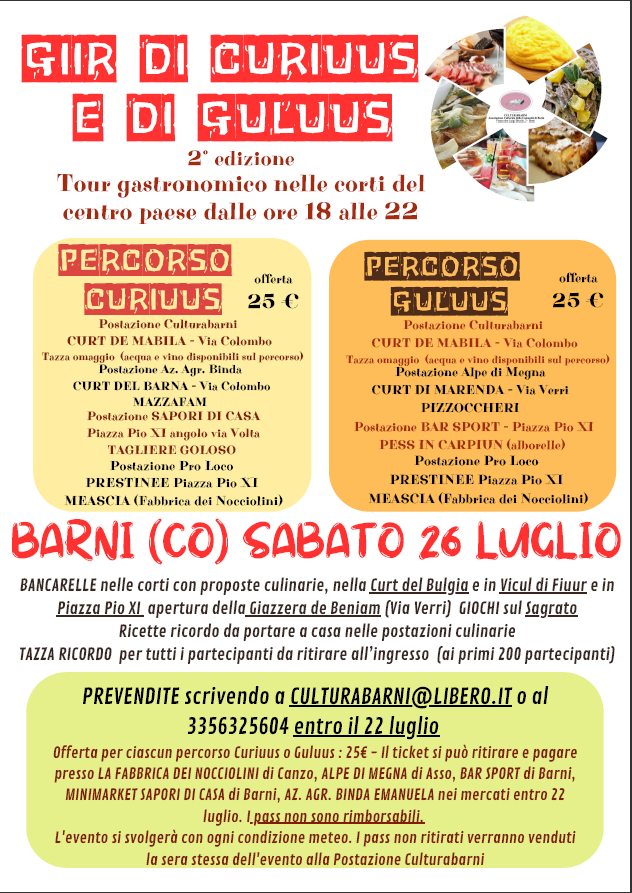 Scopri il cuore gastronomico e culturale del borgo di Barni (CO) sabato 26 luglio con la seconda edizione del ‘Giir di curiuus e di guluus’, un tour gastronomico che ti porterà a scoprire i sapori autentici della tradizione lombarda in un percorso unico tra le corti storiche del paese e le eccellenze del territorio