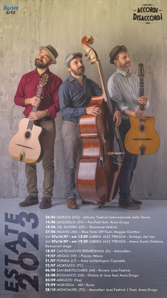 Accordi Disaccordi è un progetto italiano attivo nel panorama musicale nazionale ed internazionale. Il trio, nato nel 2012, è composto da Alessandro Di Virgilio e Dario Berlucchi alle chitarre e da Dario Scopesi al contrabbasso. In oltre 10 anni di attività hanno collezionato più di 3.000 spettacoli, tra cui 12 esibizioni all’Umbria Jazz (tra il 2015 e il 2022), 6 concerti sold out al Blue Note, partecipazioni a festival internazionali, come Jazz à Juan (2016), Moscow Jazz Festival (2018), JazzMi (2018) e Athens Technopolis Jazz (2018), e diverse tournée in tutta Europa, negli Stati Uniti, in Australia e negli Emirati Arabi.
