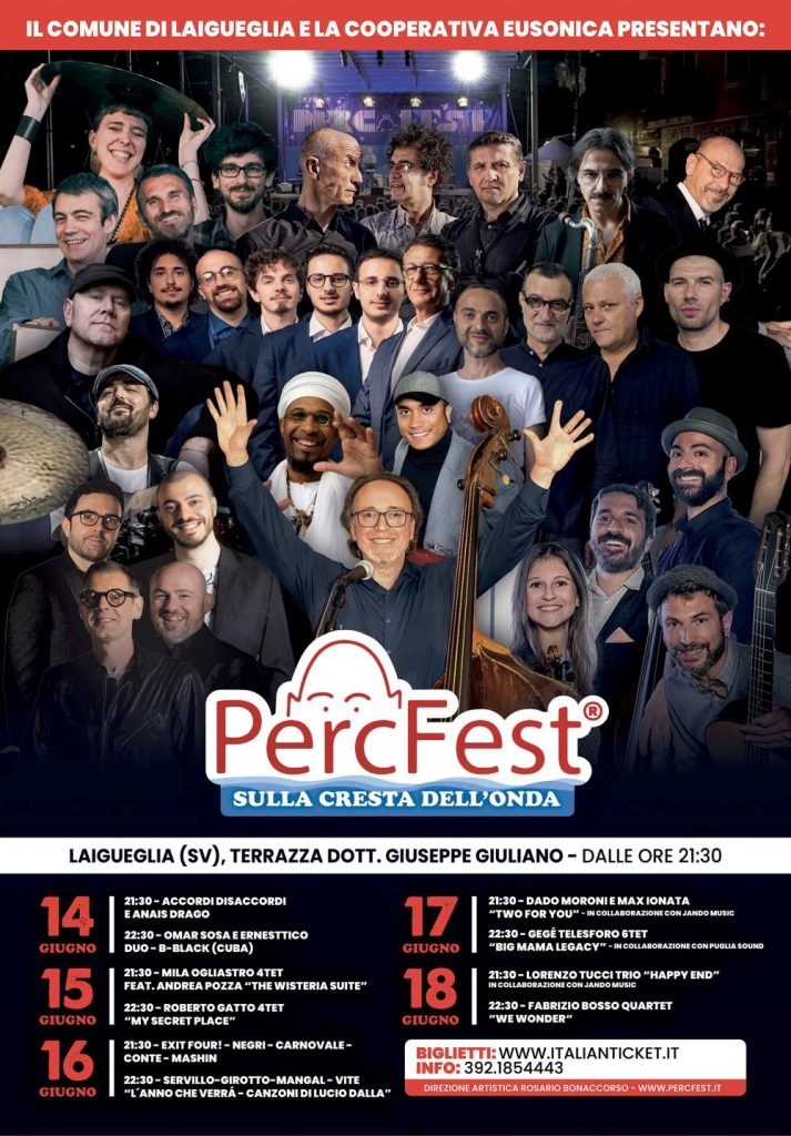 Il trio ACCORDI DISACCORDI inaugura la stagione estiva di concerti con la partecipazione alla 27° edizione del PercFest, La festa europea del jazz e delle percussioni. L’evento si svolgerà il 14 giugno presso la Terrazza Giuseppe Giuliano di Laigueglia (Savona) e per l’occasione saranno accompagnati dalla violinista e compositrice ANAIS DRAGO.