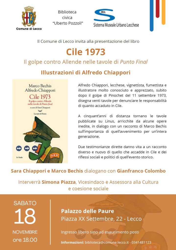 La serata, introdotta dal Vicesindaco di Lecco, assessore alla cultura Simona Pizza, prevede preziosi interventi di interventi Sara Chiappori, curatrice del volume, e Marco Bechis, moderati da Gianfranco Colombo. Così l’assessore alla Cultura del Comune di Lecco Simona Piazza: “Tanti gli appuntamenti promossi dal Simul e dalla nostra biblioteca, che prosegue con gli incontri di presentazione di libri con gli autori. L’appuntamento di venerdì in biblioteca, per la rassegna dedicata ai 150 anni dalla morte di Alessandro Manzoni, si propone di avvicinare i giovani al suo capolavoro attraverso un libera reinterpretazione in chiave noir di “Fermo e Lucia”, mentre l’appuntamento di sabato al Palazzo delle Paure, alla presenza di Sara Chiappori, ci consente di evocare gli avvenimenti cileni di quel 1973, ma soprattutto riportare all’attenzione del pubblico lecchese le tavole illustrate in quella occasione da Alfredo Chiappori, che l’Amministrazione comunale ha già omaggiato all’interno del progetto “Terra fertile”. Un’occasione anche per ripercorrere la storia di un paese e il suo legame con la città di Lecco, testimoniato dalla cittadinanza onoraria conferita a Luis Sepulveda nel 2015. Due appuntamenti per valorizzare dunque e promuovere al cultura e l’arte del nostro territorio”.