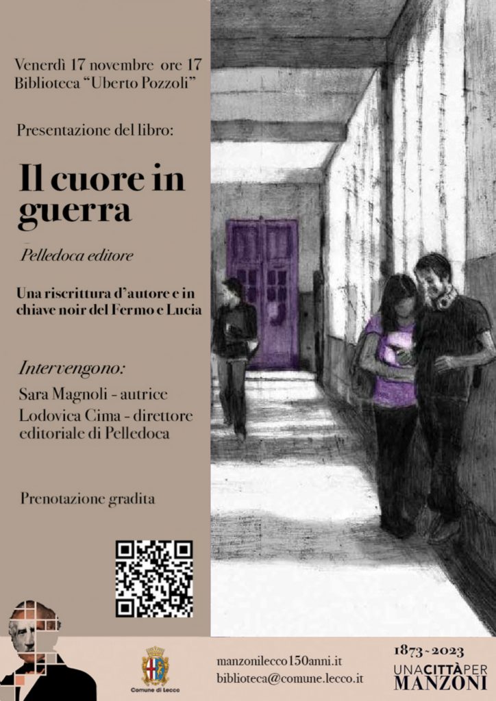 La Biblioteca civica Uberto Pozzoli di Lecco, per la rassegna “1873-2023 Una città per Manzoni” ospita venerdì 17 novembre alle 17.00 la presentazione del libro “Il cuore in guerra” di Sara Magnoli, con illustrazioni di Riccardo Ambrosi. Il libro, edito da Pelledoca editore, è una rilettura liberamente ispirata e adattata in chiave moderna del “Fermo e Lucia” di Alessandro Manzoni, con una forte atmosfera noir. L’autrice, giornalista, laureata in lingue e letterature straniere moderne, vive a Varese e, con i suoi romanzi per ragazzi e per adulti, ha vinto numerosi premi.