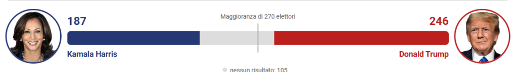 Donald Trump verso la Casa Bianca, risultato alle 7 di questa mattina stracciante nei confronti di Kamala Harris 187 a 246 (dato non definitivo) che fa comprendere la valanga di voti presi dal Ticoon. I due contendenti non hanno ancora parlato. Intanto i seggi in Alaska chiudono e le elezioni americane sono terminate.