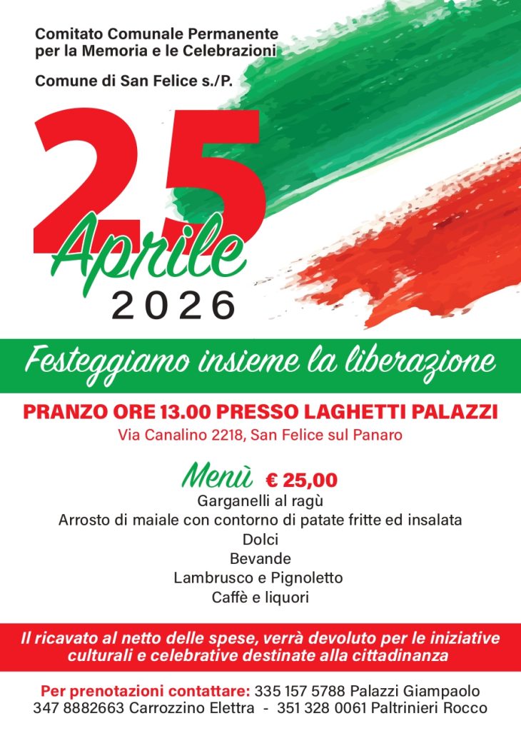 Sabato 25 aprile si svolgerà a San Felice sul Panaro la celebrazione dell’81esimo anniversario della Liberazione. Si comincia alle 8.45 con il raduno del Comitato permanente per la Memoria e le Celebrazioni e le autorità presso il cimitero di San Biagio, dove sarà deposta una corona d’alloro sulla lapide di Agostino Baraldini. Alle 9 sarà deposta un’altra corona di alloro presso il Cippo di Rivara. Alle 9.15, al Parco Marinai d’Italia, alzabandiera e deposizione di una corona d’alloro. Alle 9.30 deposizione corona d’alloro anche al Monumento ai Caduti in piazza Castello. A seguire interventi di Amministrazione comunale, Anpi, Associazione nazionale bersaglieri, sezioni di San Felice sul Panaro e degli alpini. Alle 10 corteo per le vie del centro e deposizione di una corona d’allora alla casa dell’ammiraglio Carlo Bergamini. Alle 10.30 santa messa celebrata nella chiesa di piazza Italia. In caso di maltempo gli interventi si svolgeranno al termine della messa. I cittadini sono invitati a partecipare e a esporre il Tricolore. Organizzano il Comune di San Felice e il Comitato permanente per la Memoria e le Celebrazioni. A seguire, alle 13, presso Laghetti Palazzi in via Canalino, 2218, ci sarà un pranzo per festeggiare la Liberazione, menù di 25 euro, il cui ricavato, al netto delle spese, sarà devoluto per iniziative culturali e celebrative destinate alla cittadinanza. Per prenotazioni: 335/1575788 (Giampaolo Palazzi), 347/8882663 (Elettra Carrozzino), 351/3280061 (Rocco Paltrinieri).