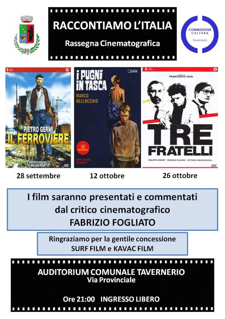 La Commissione Cultura del Comune di Tavernerio è lieta di invitarvi alla rassegna cinematografica, che si terrà presso l’Auditorium alle ore 21.00 in via Provinciale, nei giorni :