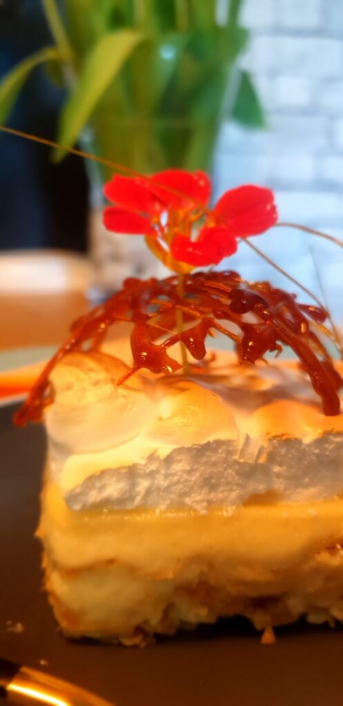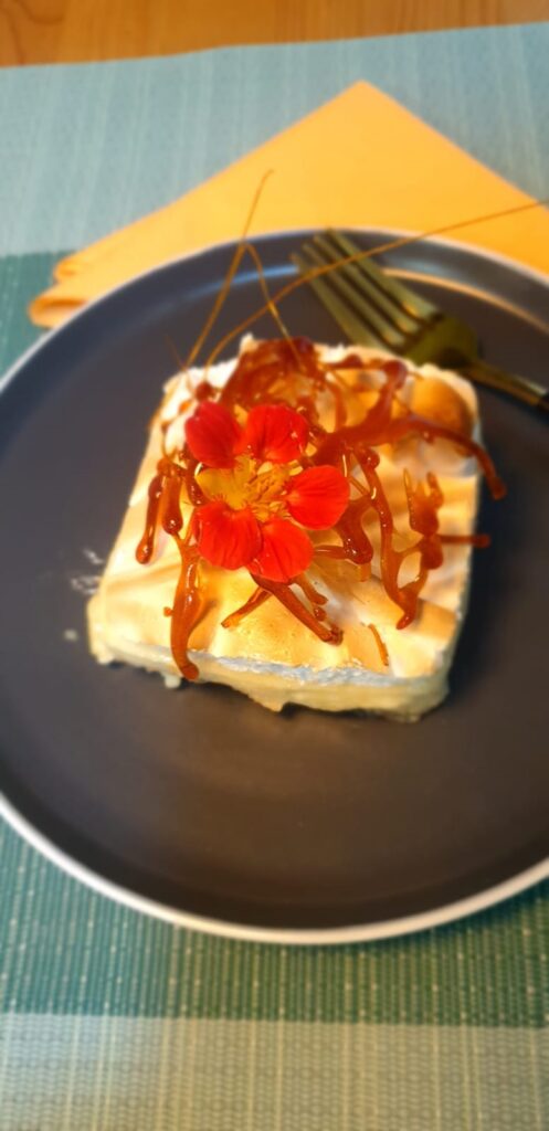 Montate a neve gli albumi con 220 g di zucchero, spalmate la meringa sopra. Cuocere in forno forte per pochi minuti a doratura.