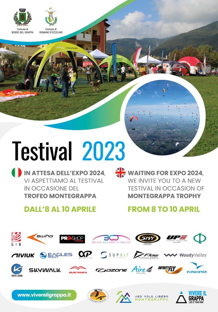 In concomitanza si svolgerà il cosiddetto Testival del Volo Libero, gioco di parole tra “testare” e “festival”. Infatti s aranno presenti i rappresentanti di molti brand di volo libero pronti a far testare i loro prodotti agli interessati. Sabato 8 aprile gli stand saranno aperti presso l’atterraggio Garden Relais, mentre domenica 9 e lunedì 10 aprile presso gli impianti sportivi di Romano d’Ezzelino.
